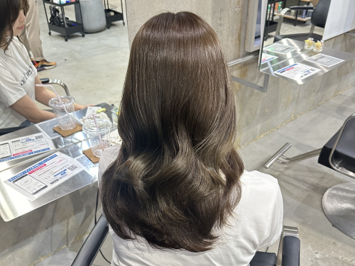 髪の赤味が気になる方におすすめの「オリーブグレージュ」。イルミナカラーを使用することで、透明感のあるくすみ系カラーを実現し、赤味を抑えながらも柔らかく自然な印象に仕上がります。オリーブグレージュは、グリーンのニュアンスが加わることで肌の透明感を引き立て、秋冬の落ち着いたファッションとも相性抜群!