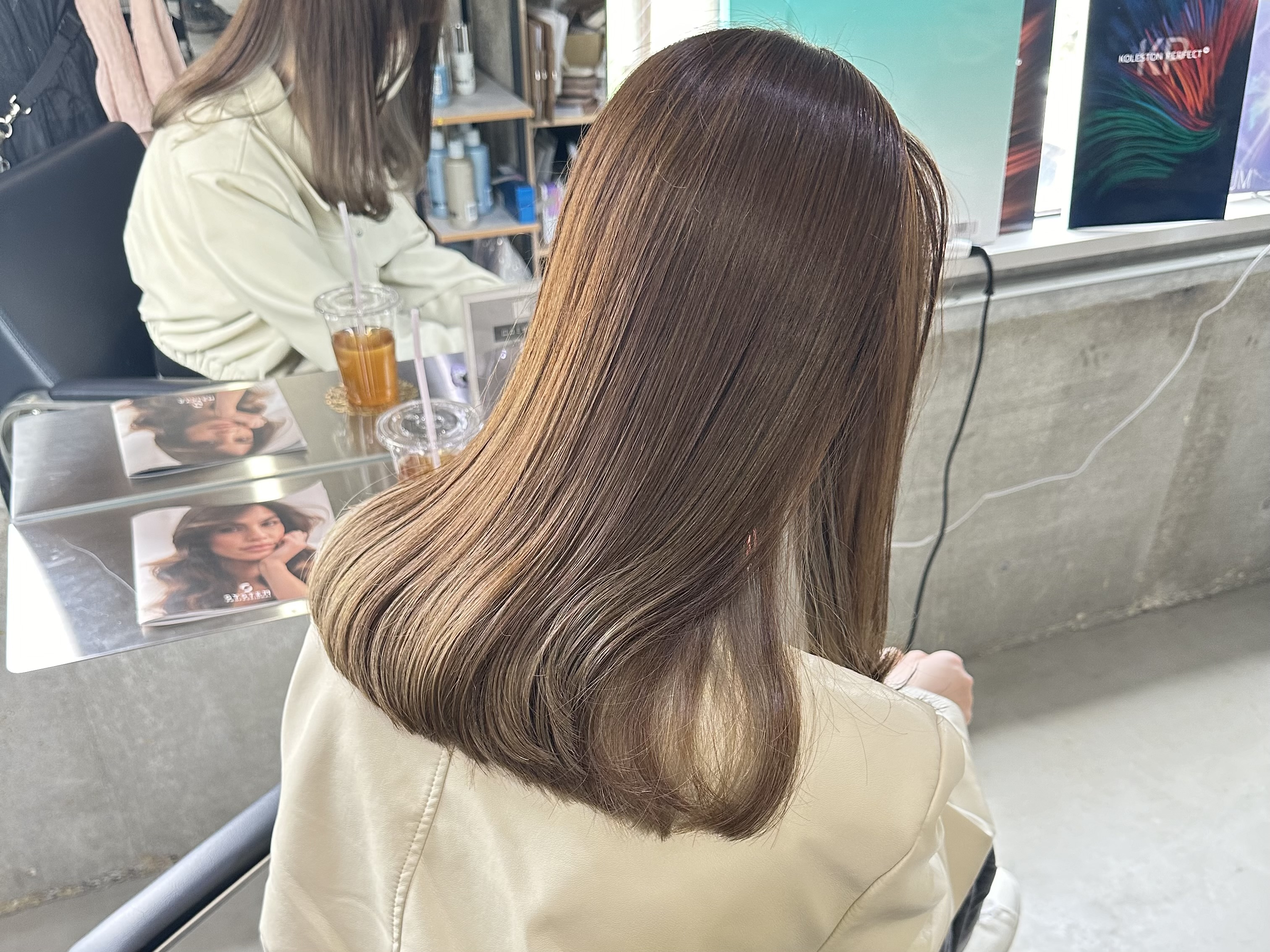 ブリーチなしでも透明感のある髪色を実現できる「イルミナダブルカラー」は、ダメージを最小限に抑えつつ、自然なツヤ感と透き通るような仕上がりが魅力です。イルミナカラーの特徴である光沢感が、まるで光を纏ったかのような髪色を演出します。明るすぎないのに、しっかりとした透明感があり、落ち着きのある大人の雰囲気に。
